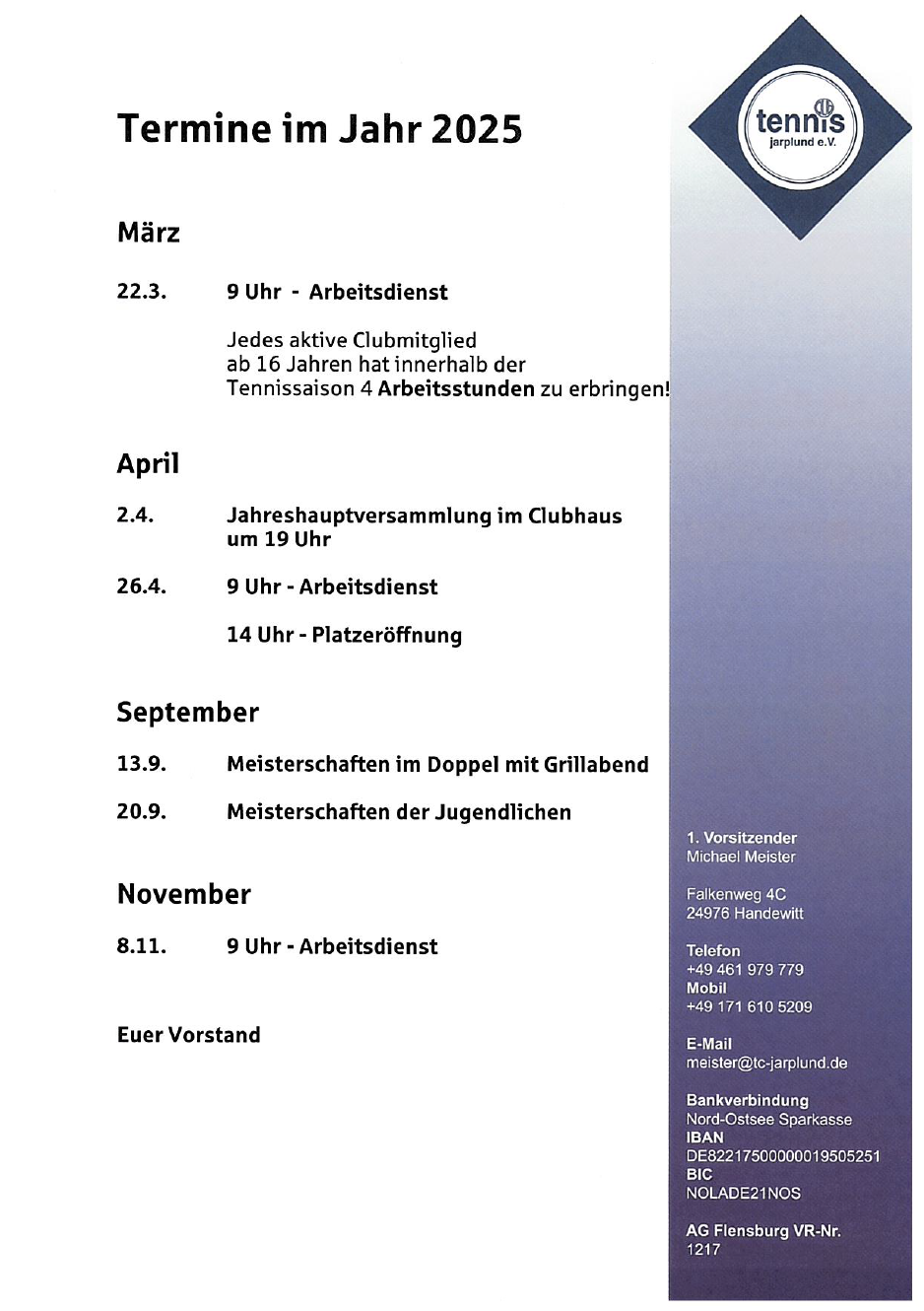 auch unser Tennisclub nutzt die moderne Medienwelt. Wir haben eine Homepage erstellt. Der “Leitz-Ordner” gibt die Ordnungs-Struktur vor. Viele Abschnitte sind noch zu füllen. Eine perfekte Lösung ist nicht immer möglich - erfreuen Sie sich daher an dem Geschaffenen. Unser Verein verfügt über 3 sehr schöne Außenplätze und ein gepflegtes Clubheim zum Erholen und Entspannen. Begeben Sie sich nun auf einen virtuellen Rundgang durch unseren Tennisverein und überzeugen Sie sich von unserem Angebot und unseren Leistungen rund um den Tennissport